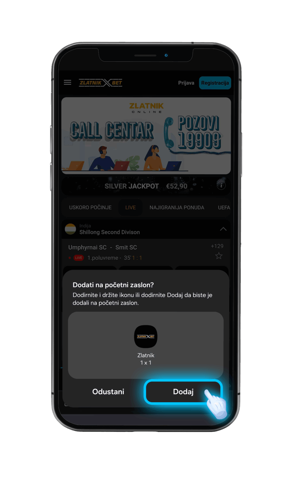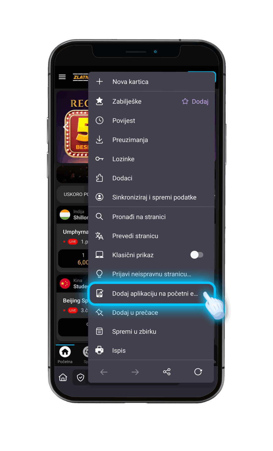KORAK 1 Kliknite na ikonicu koju vidite na slici iznad. KORAK 2Zatim kliknete "Dodaj aplikaciju na početni ekran". KORAK 3Nakon što vam iskoči ovaj pop-up potvrdite na tipku "Dodaj".